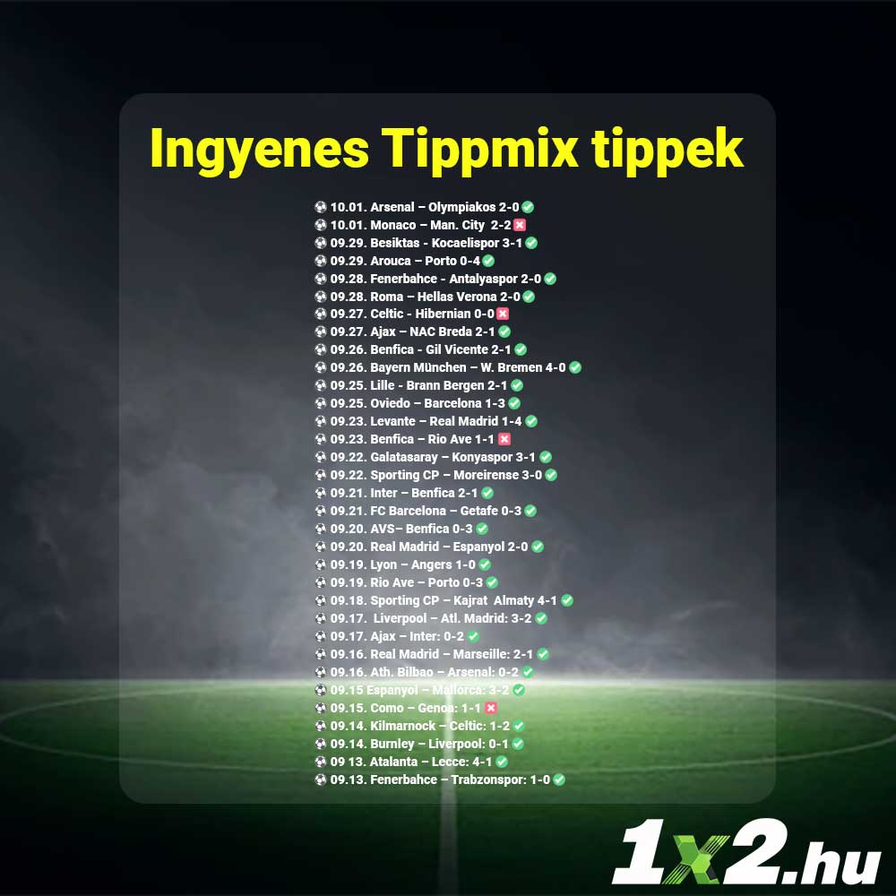 Minden nap azon dolgozunk, hogy értékes tippekkel és mérkőzést befolyásoló információkkal lássunk el. Ez a mögöttünk hagyott napokon is maximálisan sikerül. Az utolsó  kiajánlott 33 Ingyenes Tippmix tippből 29 is az elképzeléseink szerint alakult