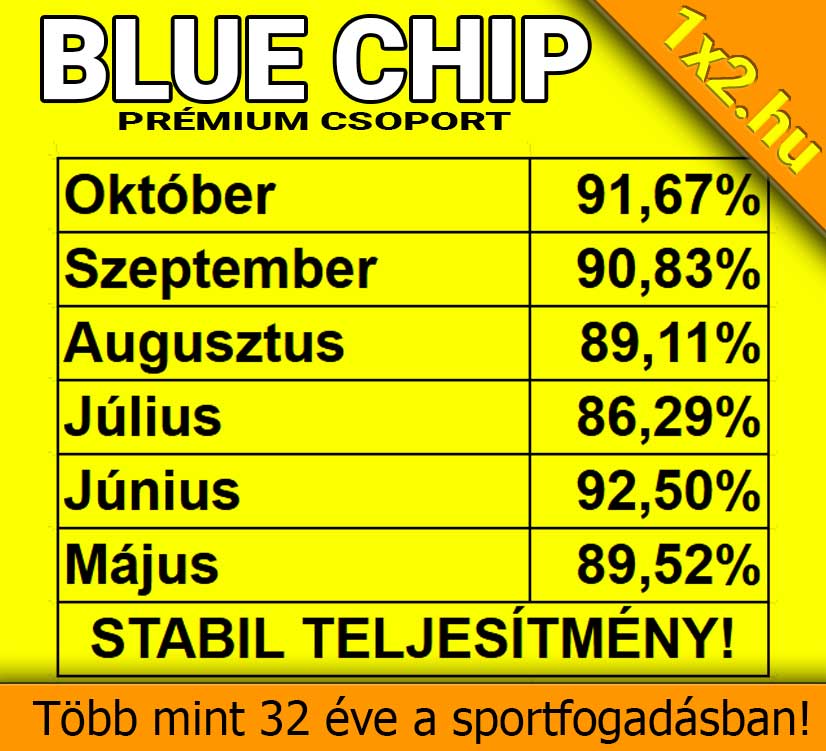 Kép a BLUE CHIP prémium csoportnál elért stabil teljesítményről hónapokra bontva. Több mint 32 év tapasztalattal a sportfogadás területén, megbízható Tippmix tippek állnak rendelkezésre. Ajánlott a sportfogadás szerelm