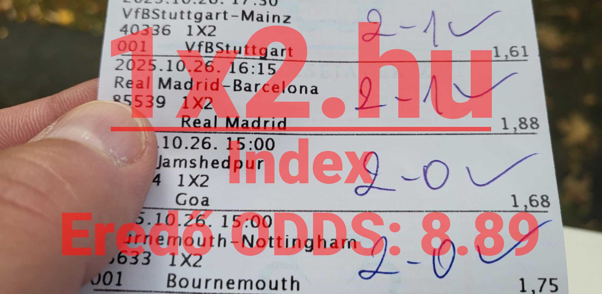 4 Precízen kidolgozott INDEX Tippmix tippel a képen látható módon törtünk borsot a fogadóirodák orra alá. A szelvényünk eredője egy közel 9.00-es odds.