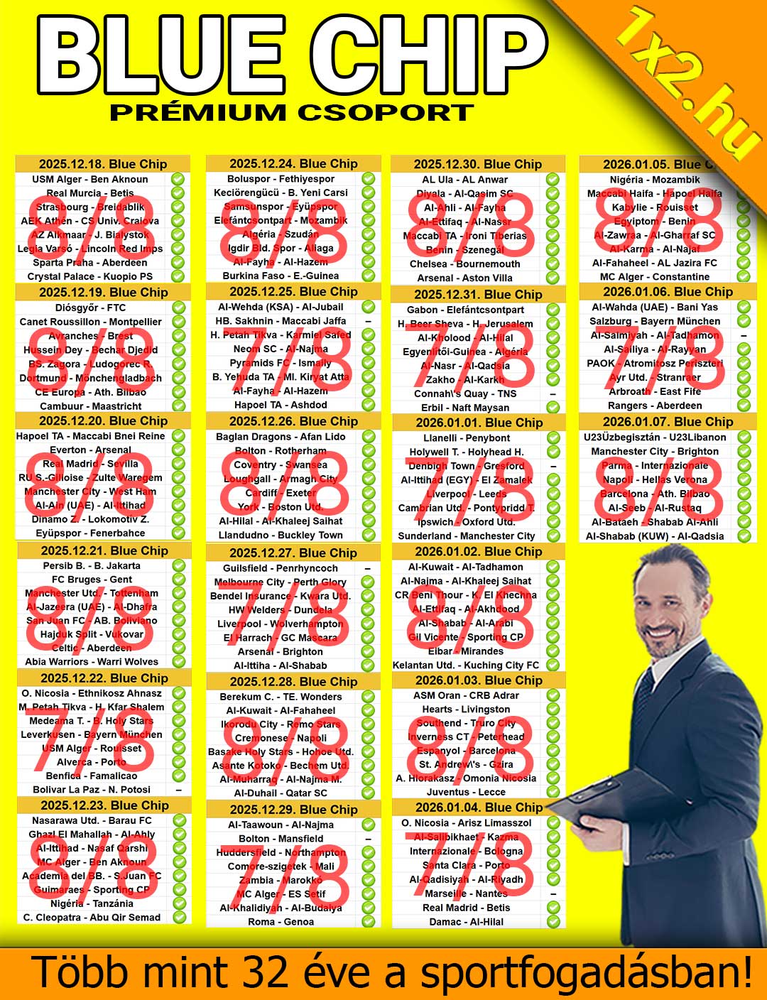 A BLUE CHIP Prémium csoportban szinte egymást követik a precízen felépített, telitalálatos szelvény ötletek. A tudatos kiválasztás, az állandó kontroll és a szigorú fegyelem a csoport alappillérei. Ezzel a fegyelmezett hozzáállással indult el a 2026-os év is. ✅