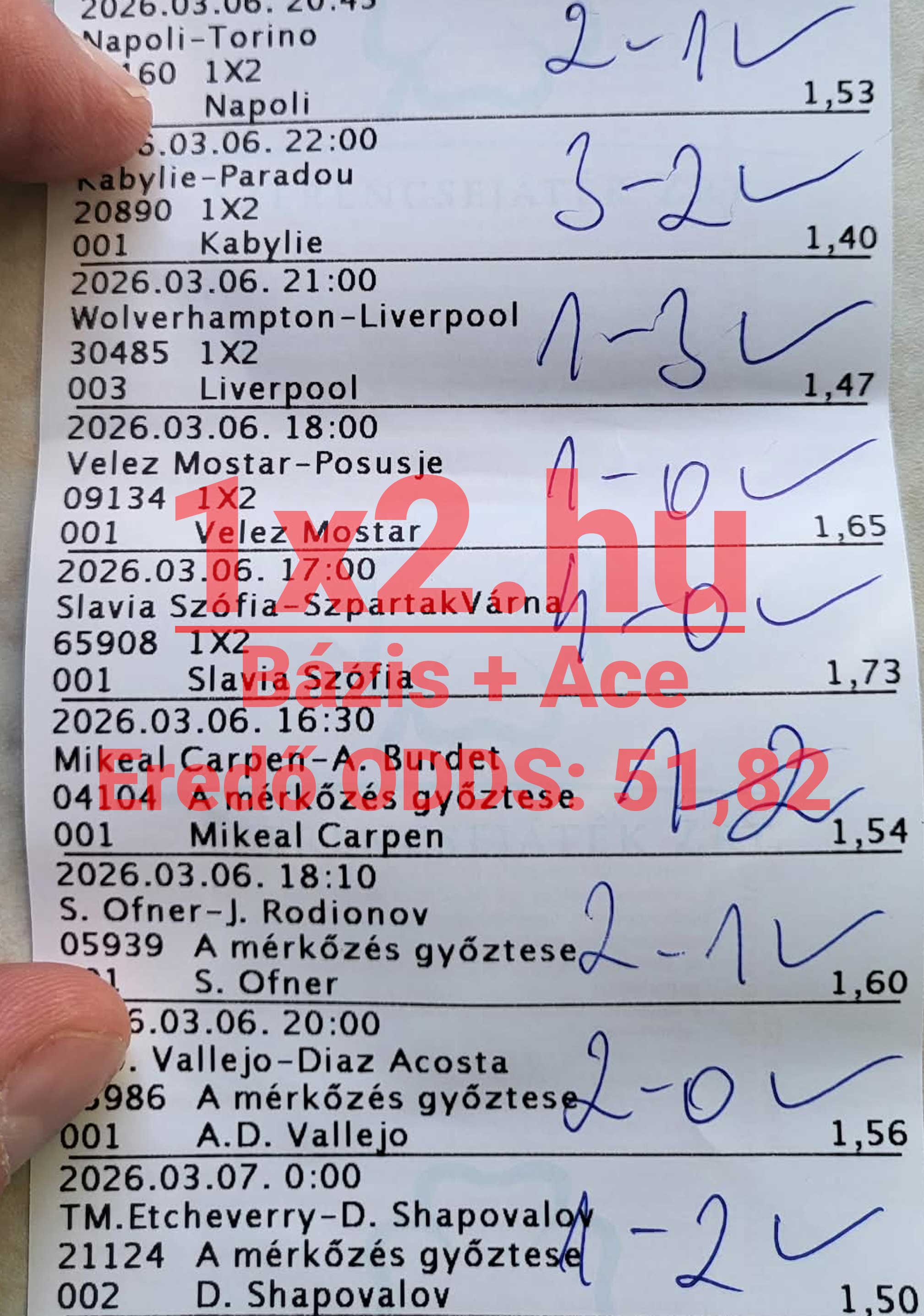 Az 1×2.hu napról napra bizonyítja, hogy minden sportágban otthonosan mozgunk, legyen az foci, tenisz, kézilabda vagy éppen asztalitenisz. A csatolt szelvényen is jól látható, hogy tegnap egy bőven 50x-es kombinációt céloztunk meg 9 profin kidolgozott Tippmix tippel. A szelvény a BÁZIS és ACE tippekből állt össze. Ma is valami hasonlóra készülünk. A több mint 32 éves sportfogadói tapasztalat remélhetőleg ma is a segítségünkre lesz majd. Az ilyen precízen kidolgozott kötések is jól mutatják, hogy a megfelelő elemzéssel és stratégiával komoly és értékes szelvények állíthatók össze.