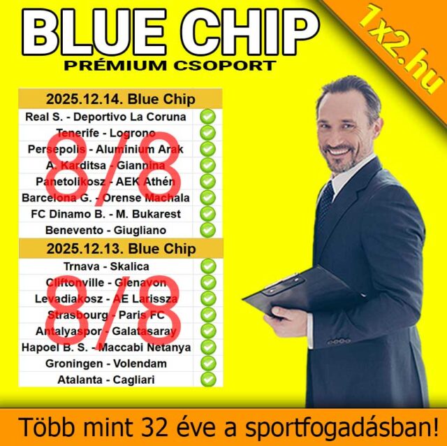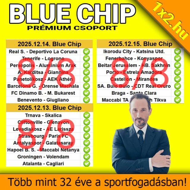 A Blue Chip Prémium csoportban naponta egy precízen kidolgozott nagytétes szelvény ötlettel jelentkezünk A szelvényeinken remekül mutatnak a magas eredő szorzók, melyek általában 1.50 és 2.50 közöttiek, de lehetnek ezen a sávon kívüli eredő oddsok is, a lényeg, hogy meghatározó és kellően hangsúlyos Prémium tippekből álljon a szelvényünk!